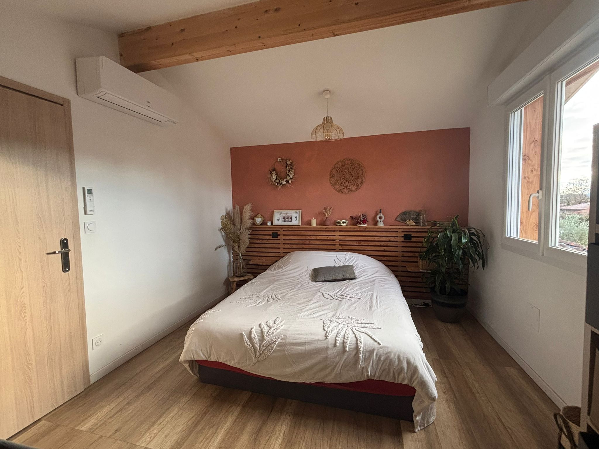 Le logement est chauffé par un poêle à bois et une climatisation réversible à l'étage.