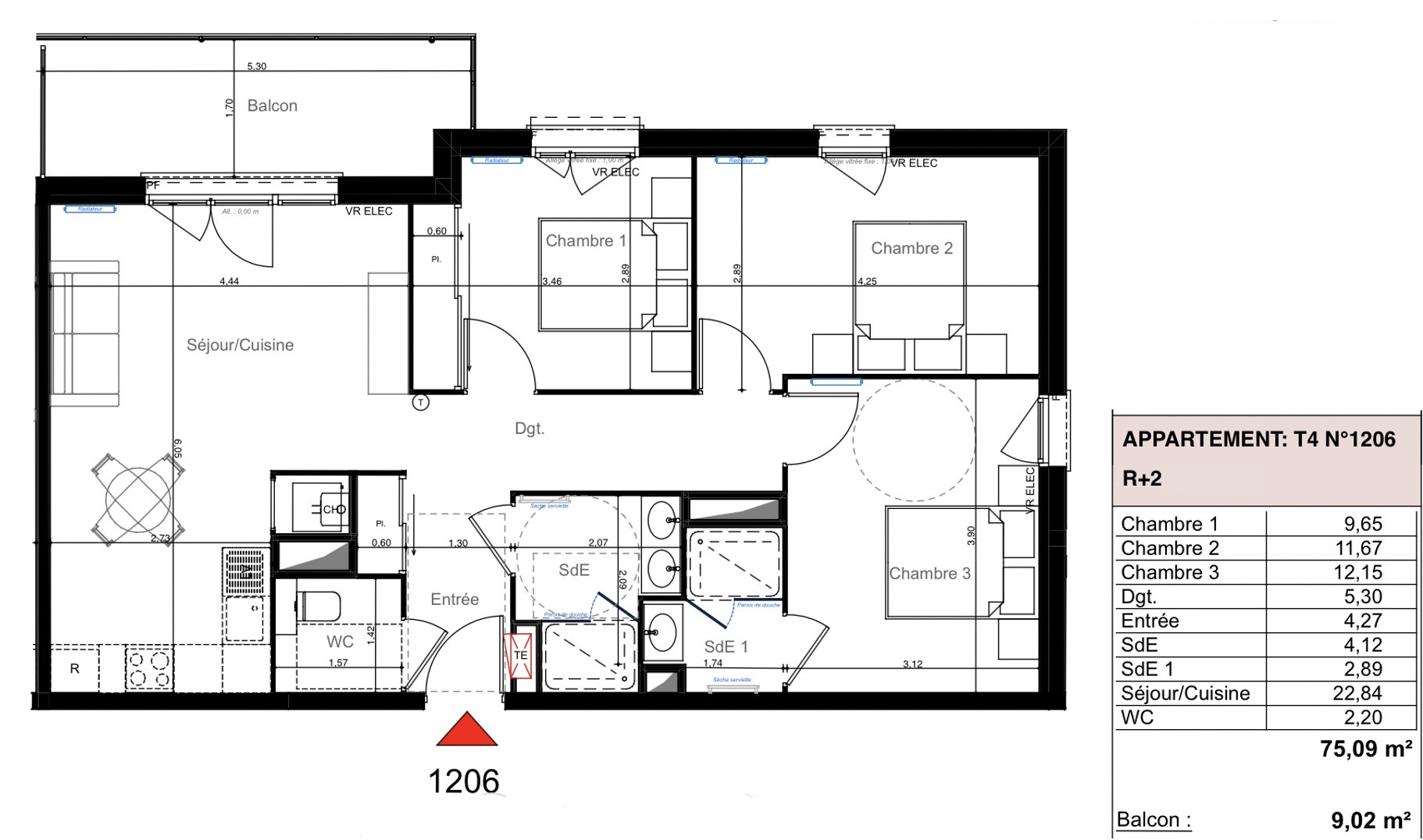 L'appartement comprend 3 chambres, une salle d'eau avec WC indépendant, une cuisine ouverte sur le séjour, ainsi qu'un balcon de 9,02m².