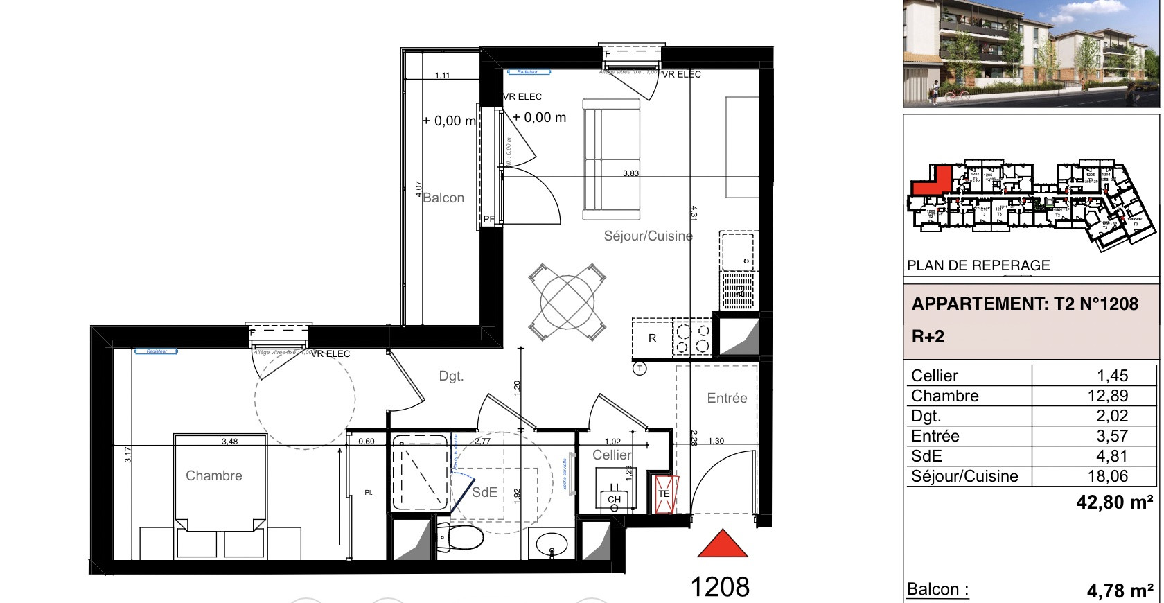 L'appartement comprend une chambre, une salle d'eau avec WC indépendant, une cuisine ouverte sur le séjour, ainsi qu'un balcon de 7,20 m².